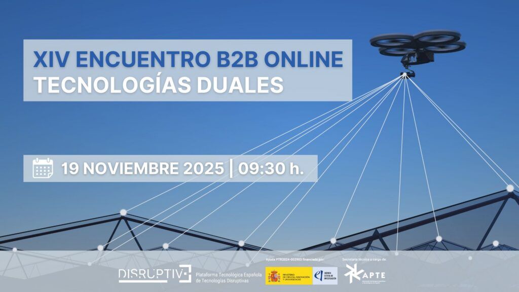 El XIV Encuentro B2B online sobre tecnologías duales, organizado por la Plataforma Tecnológica de Tecnologías Disruptivas (DISRUPTIVE), se celebrará el 19 de noviembre a las 9:30h a través de ZOOM. El evento reunirá a empresas y entidades destacadas por su aplicación de tecnologías digitales disruptivas, como Blockchain, Big Data e Inteligencia Artificial, 5G, Ciberseguridad y Computación Cuántica, en el ámbito dual (civil y militar).